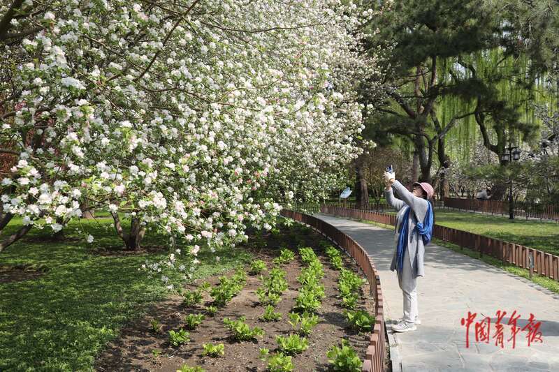 4月8日,北京市欣然亭公园,又名旅客在拍摄敞开的海棠花。中青报·中青网记者 孔斯琪/摄