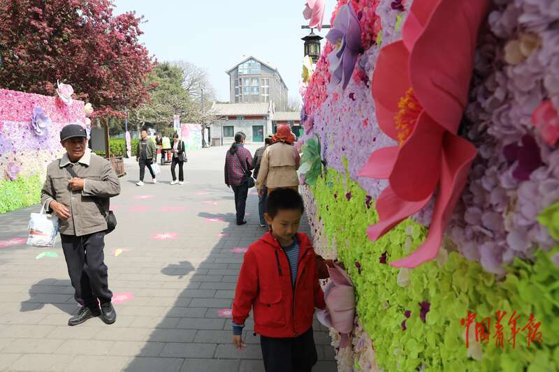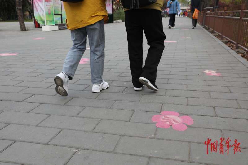 4月8日,北京市欣然亭公园,市民和旅客走在印有海棠花图样的地砖上。中青报·中青网记者 孔斯琪/摄