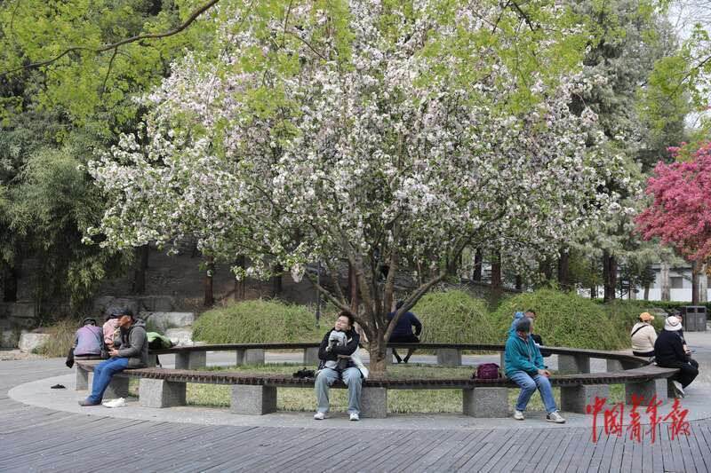 4月8日,北京市欣然亭公园,市民和旅客坐在敞开的海棠花下休息。中青报·中青网记者 孔斯琪/摄