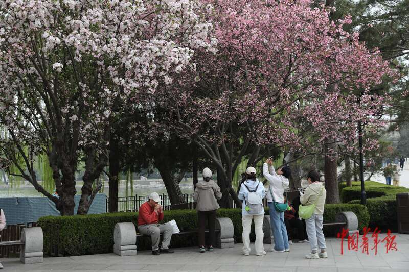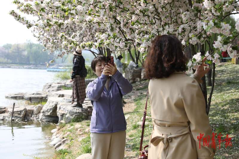 4月8日,北京市欣然亭公园,市民和旅客在不雅赏、拍摄敞开的海棠花。中青报·中青网记者 孔斯琪/摄