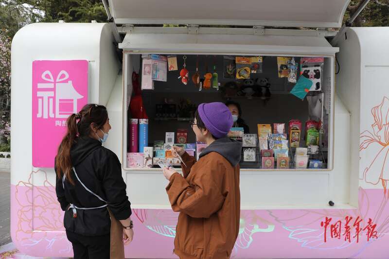 4月8日,北京市欣然亭公园,又名旅客正在购买海棠花有关文创家具。中青报·中青网记者 孔斯琪/摄