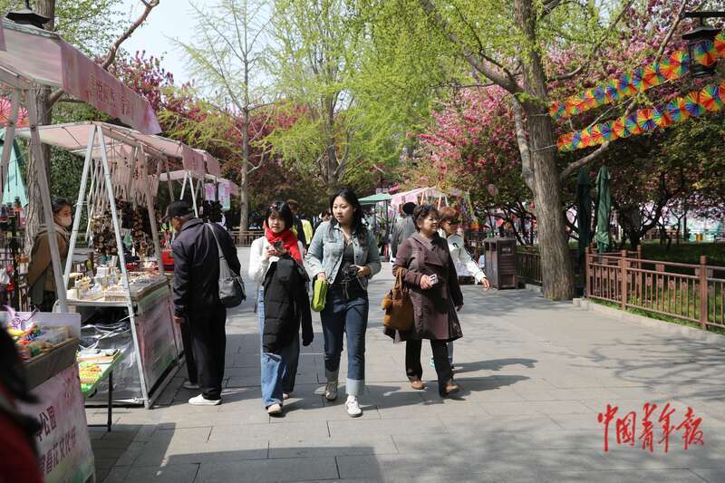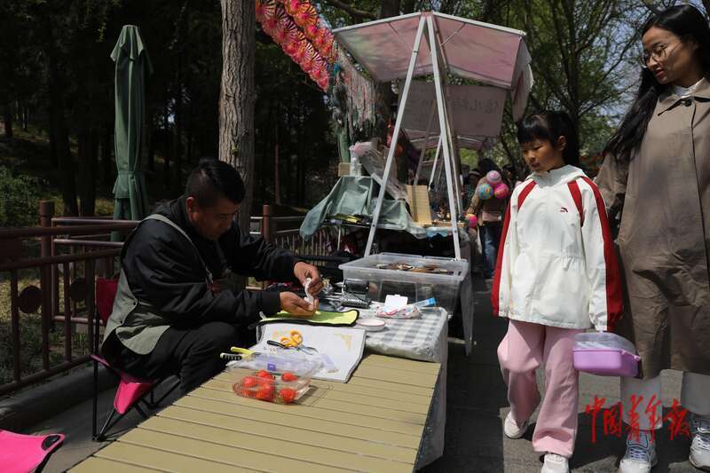 4月8日,北京市欣然亭公园,市民和旅客在海棠花下逛阛阓,一家不错现场开蚌取珍珠的摊位眩惑了又名小一又友的防备。中青报·中青网记者 孔斯琪/摄