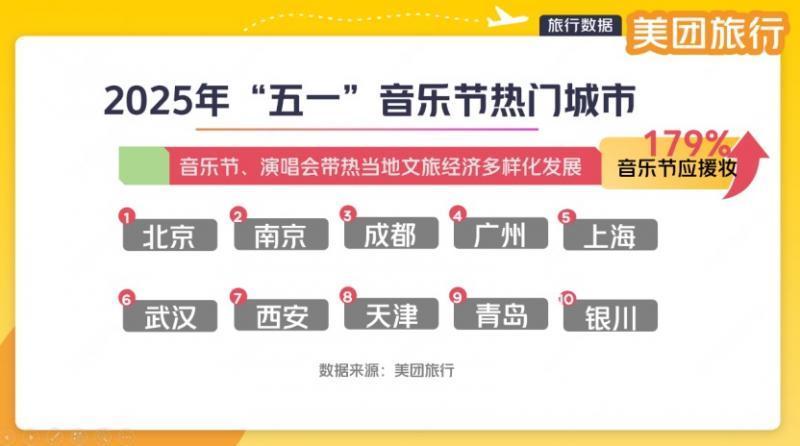 r除了传统旅游资源,本年“五一”,蛊惑游客来北京的一简略素还有音乐节和演唱会。好意思团旅行数据涌现,“五一”前夜,“音乐节应援妆”搜索量高涨179%,搜索者中00后年青东说念主占比超30%。“五一”音乐节Top10的热点城市为:北京、南京、成齐、广州、上海、武汉、西安、天津、青岛、银川。