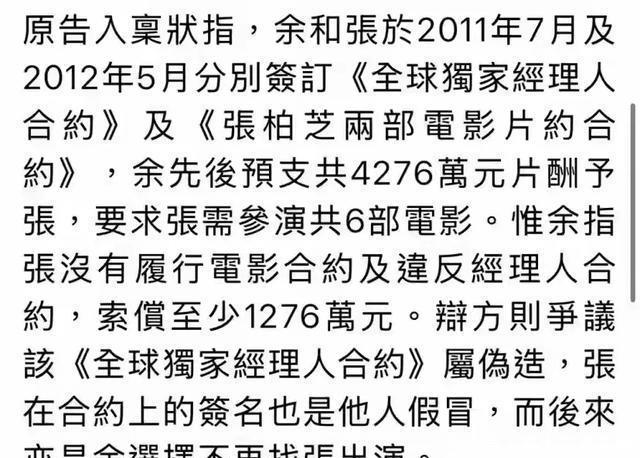 他说2011年张柏芝刚经验仳离和形象危险,急着凑钱买房,我方出于情感签了八年合约,前后预支4276万港元片酬,让她拍六部电影,后果张柏芝拿了钱却一部没达成,只可告上法庭要补偿。 可张柏芝这边径直翻了脸,讼师当庭否定整个指控,说那份合约是伪造的,签名王人不是她本东说念主的。