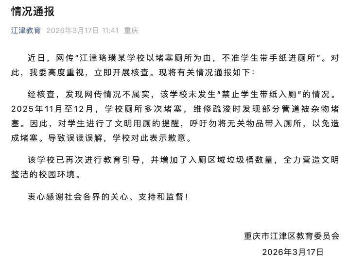 3月17日,重庆市江津区锻真金不怕火委员会发布情况通报:近日,网传“江津珞璜某学校以堵塞茅厕为由,不准学生带手纸进茅厕”。对此,我委高度凝视,立即开展核查。经核查,发现网传情况不属实凯发·k8国际app(中国)官方网站,该学校未发生“退却学生带纸入厕”的情况。2025年11月至12月,学校茅厕屡次堵塞,维修相易时发现部分担说念被杂物堵塞。因此,对学生进行了娴雅用厕的领导,命令勿将无关物品带入茅厕,以免形成堵塞。导致误读歪曲,学校对此示意歉意。