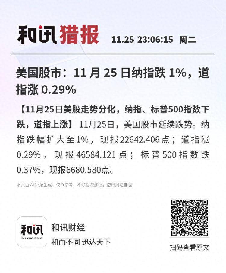 【11月25日好意思股走势分化,纳指、标普500指数着落现金凯发·k8国际app平台,谈指高涨】11月25日,好意思国股市不时跌势。纳指跌幅扩大至1%,现报22642.406点;谈指涨0.29%,现报46584.121点;标普500指数跌0.37%,现报6680.580点。